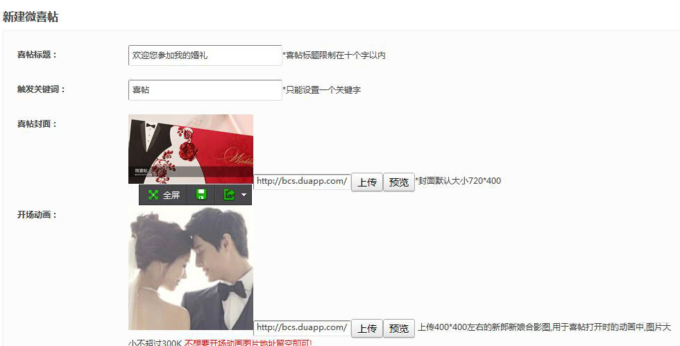1,開場動畫:進入婚慶喜帖的開場動畫,上傳400*400左右的新娘新郎合影圖,用于喜帖打開時的動畫中,圖片大小不超過300k,不需要即可留白