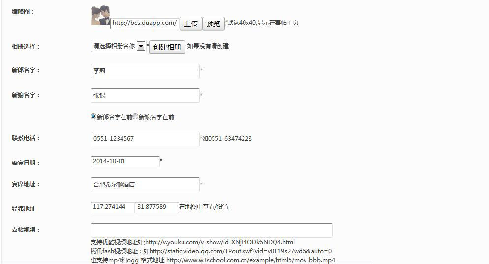 在系統(tǒng)后臺點擊【微婚慶(喜帖)】【新增喜帖】點擊設(shè)置婚慶喜帖內(nèi)容如下圖: