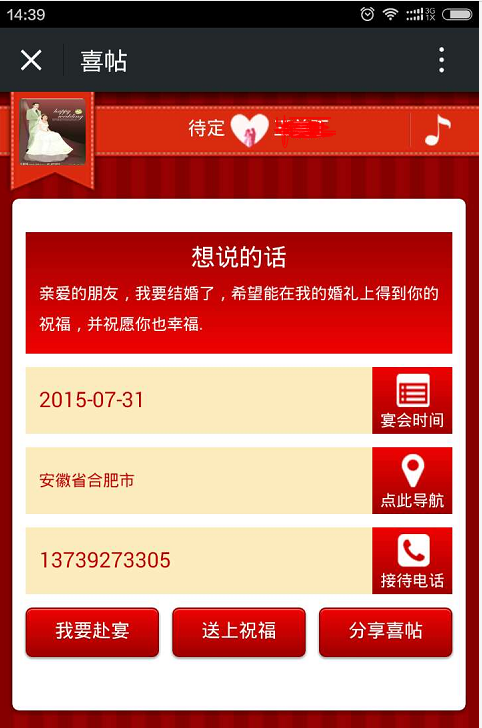 之后點擊圖文消息進入婚慶可以送祝福,赴宴等功能操作