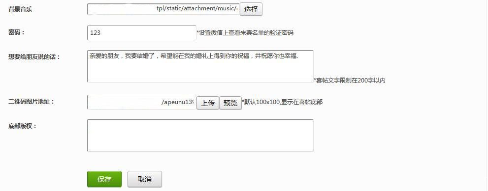在系統(tǒng)后臺點擊【微婚慶(喜帖)】【新增喜帖】點擊設(shè)置婚慶喜帖內(nèi)容如下圖: