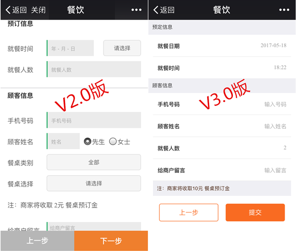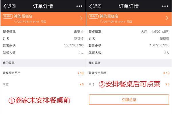 3)預(yù)定流程升級(jí):為了進(jìn)一步加強(qiáng)餐廳對(duì)餐桌的統(tǒng)一分配和管理,V3.0則由商家為預(yù)定顧客分配餐桌。商家安排餐桌之后,顧客能通過自己的訂單詳情進(jìn)入點(diǎn)餐頁(yè)面,進(jìn)行點(diǎn)菜和支付。