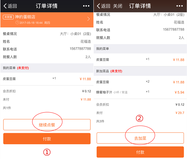 2)訂單詳情實(shí)現(xiàn)多入口加菜:顧客掃碼點(diǎn)餐下單后,可以在訂單詳情中通過“繼續(xù)點(diǎn)餐”進(jìn)行加菜。支付后,也能通過“去加菜”實(shí)現(xiàn)加菜。