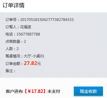 4)訂單詳情新增現(xiàn)金收款:顧客用餐結(jié)束結(jié)賬時(shí),若無法進(jìn)行在線支付,或支付余額不足時(shí),店員可在后臺(tái)該顧客的訂單詳情中,為顧客選擇現(xiàn)金收款。