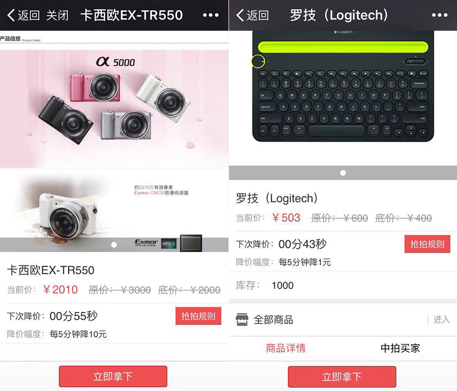 每隔一分鐘,商品的價(jià)格和庫存就會刷新一次。漸漸流逝的時(shí)間和逐漸減少的庫存,想等到最低價(jià)再拍?Too na?ve,已經(jīng)被搶光了啊喂!手慢了就搶不到了啊喂!劉歡大哥告訴你該出手時(shí)就出手你忘記了嘛?!