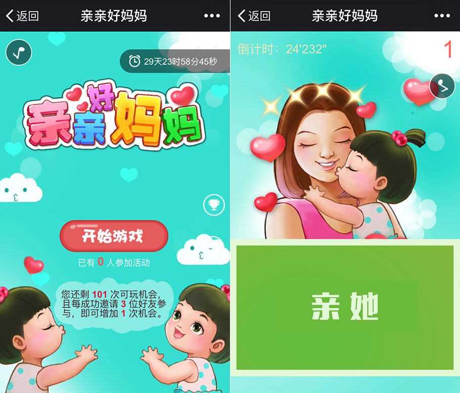 《親親好媽媽》:麻麻辛苦操勞了一輩子,節(jié)日告白,怎么吻她也不嫌多!粉絲點(diǎn)擊“親她”按鈕,即能為媽媽送上一個(gè)吻。在規(guī)定時(shí)間內(nèi),送吻越多,得分越高。