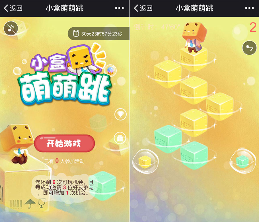 《小盒萌萌跳》:該游戲由上班族動(dòng)漫形象代言人“張小盒”擔(dān)任主人翁。玩家根據(jù)格子的顏色,選擇點(diǎn)擊左右的顏色按鈕。在規(guī)定時(shí)間內(nèi),小盒跳的格子越多,得分越高。支持商家自主定制,游戲背景、游戲音樂(lè)、主辦單位、企業(yè)logo、游戲元素等等,都是商家植入品牌信息的風(fēng)水寶地。