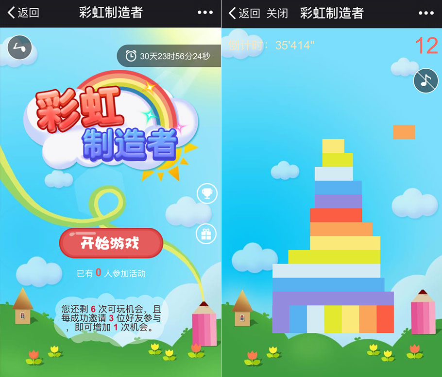 《彩虹制造者》:想知道彩虹的秘密?So easy!玩家點擊滑動的彩虹條,選擇合適的位置放置。每疊一個,多出的部分會被切掉。以此類推,疊出的彩虹越長,得分越高。游戲自帶的分享、排名、體驗、抽獎四大營銷體系,與融合了卡券、積分、紅包、獎品的四大派獎體系,更是為商家提供了強有力的圈粉傳播技巧,讓微營銷互動性更強、營銷方式更靈活。