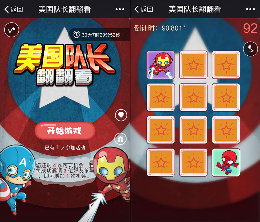 《美國隊長翻翻看》,和熱映大片幾乎保持同步推出,讓商家無成本緊跟熱點營銷。此時朋友圈正在被電影刷屏,商家伺機推出這款游戲,能瞬間引起粉絲的強烈關注。