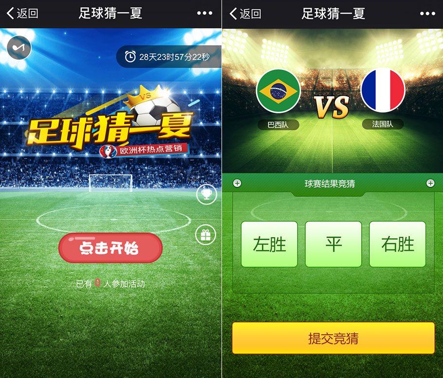 看球賽、猜輸贏。和真實(shí)球賽步步關(guān)聯(lián),猜對了就有機(jī)會中獎(jiǎng)! 進(jìn)入游戲后,根據(jù)球隊(duì)預(yù)測球賽結(jié)果,提交答案后等待真實(shí)球賽結(jié)果。球賽結(jié)束后,商家填寫正確答案,系統(tǒng)自動(dòng)匹配競猜正確者,并隨機(jī)抽獎(jiǎng)。