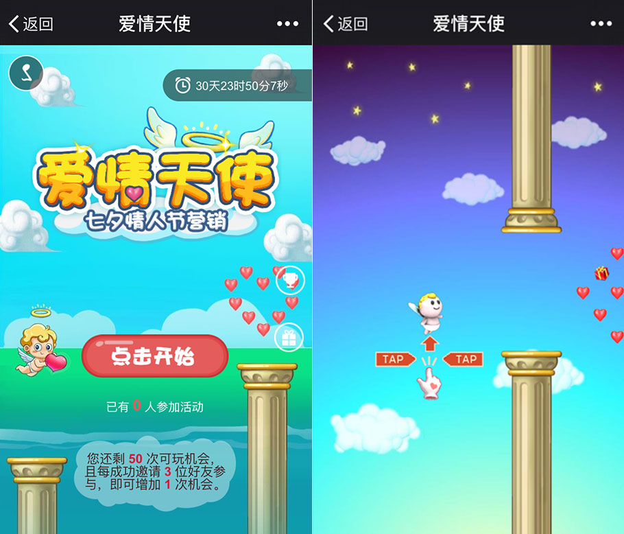 愛情之路艱險(xiǎn)坎坷,小天使勇敢追愛。粉絲需要把握好技巧,讓小天使穿越石柱,收集愛情之心。收集的越多,得分越高。