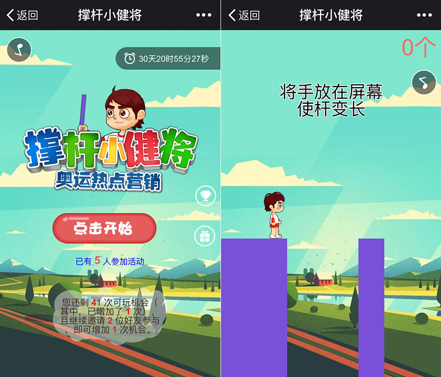 粉絲點(diǎn)擊屏幕控制撐桿的長度,讓運(yùn)動員成功走至下一關(guān)。一個(gè)不小心,撐桿太長或太短,小健將就會跌落,游戲結(jié)束。