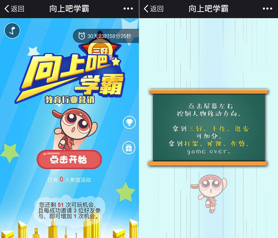 適用于教育行業(yè),如培訓、學校、幼兒園等。除此之外,像餐飲、商城、游樂園等也可以利用互動游戲,引流粉絲至線下,拉動消費。比如餐飲“玩游戲贏開學大餐”、商城“玩游戲,開學奪寶”等等以開學為主題的營銷活動,都是商家可考慮的營銷手段。提升粉絲活躍度、積極漲粉與傳播。