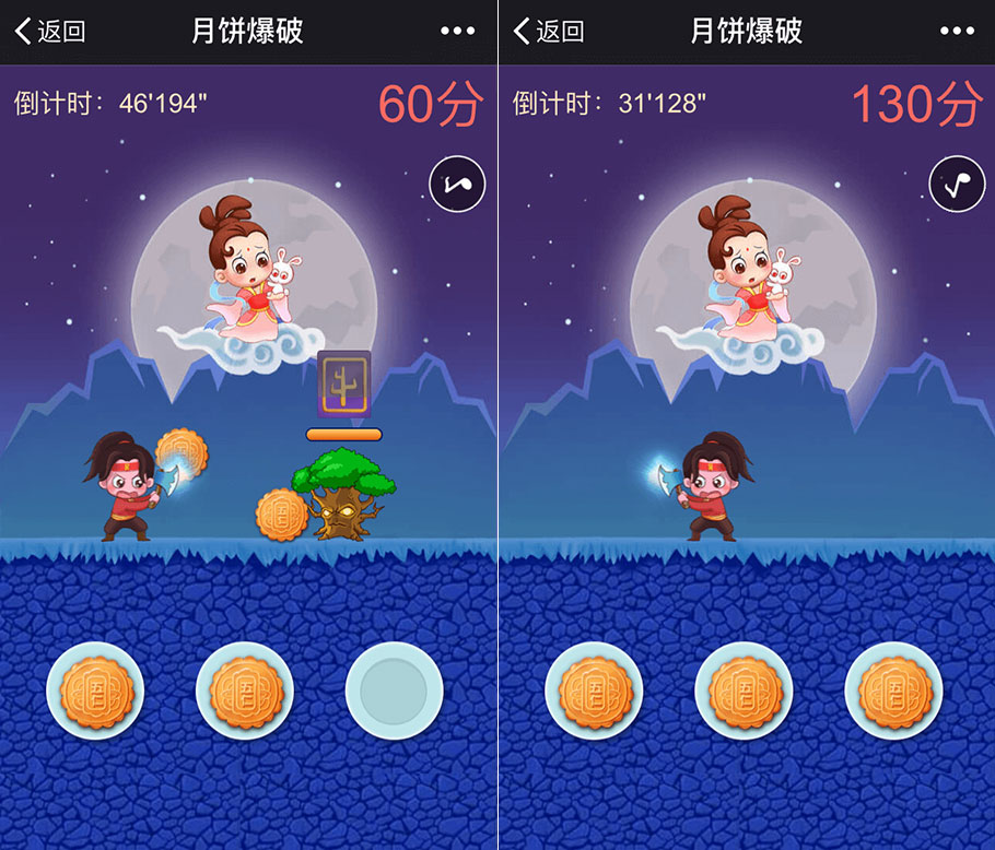 中秋之夜,守衛(wèi)嫦娥,月餅技能,能量爆破。點(diǎn)擊屏幕左右可控制勇士的移動(dòng)方向,砍殺樹妖。接收月餅可釋放技能,威力大增。在規(guī)定時(shí)間內(nèi),砍殺的樹妖越多,得分越高。阻止樹妖接近嫦娥,否則游戲結(jié)束。
