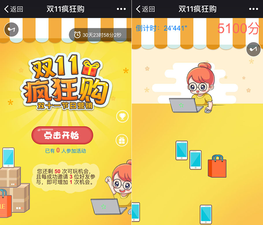 雙11就是要大肆囤貨、瘋狂買買買!點(diǎn)擊屏幕中移動(dòng)的手機(jī)、購物袋、快遞盒可得分,不幸點(diǎn)擊到白色小人會(huì)減分。在規(guī)定時(shí)間內(nèi),盡可能多得分。