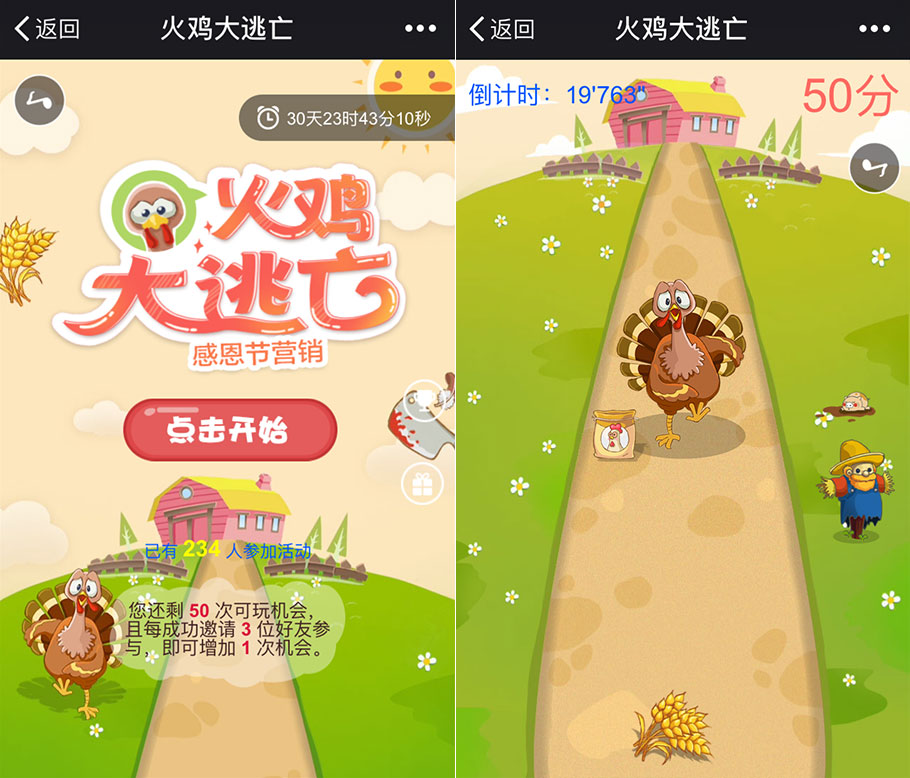 以感恩節(jié)習(xí)俗“吃火雞”為背景,結(jié)合趣味的玩法,在節(jié)日氣氛的烘托下,極易招來(lái)粉絲,為商家?guī)?lái)暴增的粉絲量和病毒式營(yíng)銷(xiāo)效應(yīng)。比如商城、零售、餐飲、娛樂(lè)等其他相關(guān)行業(yè)或有營(yíng)銷(xiāo)需求的商家,都可以拿上這款游戲,在節(jié)日里大肆“鬧騰”一番。