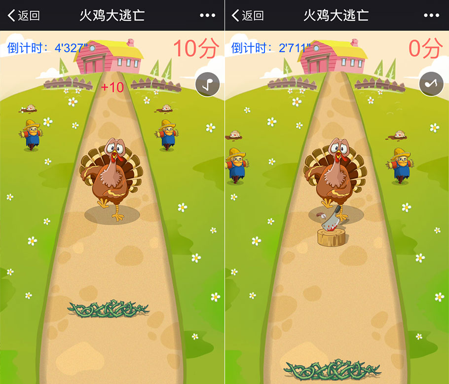 點(diǎn)擊屏幕可左右移動(dòng)逃亡的火雞,讓其吃到稻谷、飼料助長(zhǎng)體力(得分);長(zhǎng)按向上可幫助火雞躍過(guò)砧板、荊棘,避免減分。在規(guī)定時(shí)間內(nèi),得分越高,排名越高。