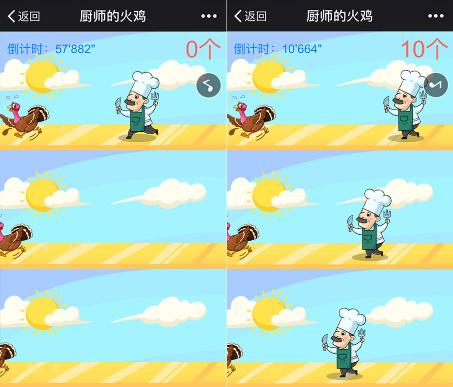 粗大事了!感恩節(jié)火雞出逃!大廚們,抄家伙,追火雞啊~~點擊屏幕可幫助廚師追趕火雞,盡量避免讓某個廚師落后,否則游戲結(jié)束。幫助的次數(shù)越多,得分越高。