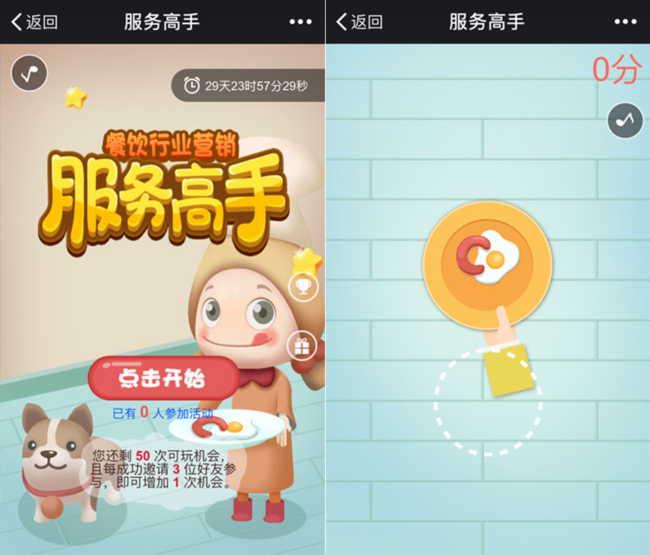 廚房小幫手,服務(wù)本領(lǐng)強。我有一百種方式接住這個荷包蛋,你信不信?移動餐盤接住跳躍的荷包蛋,可得一分。接住次數(shù)越多,得分越高。