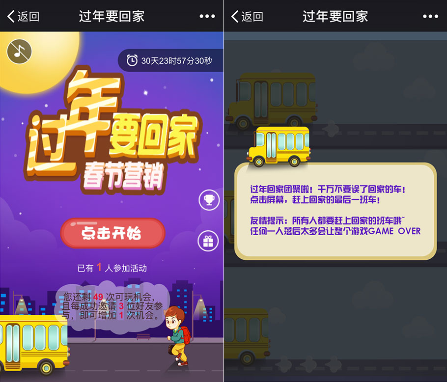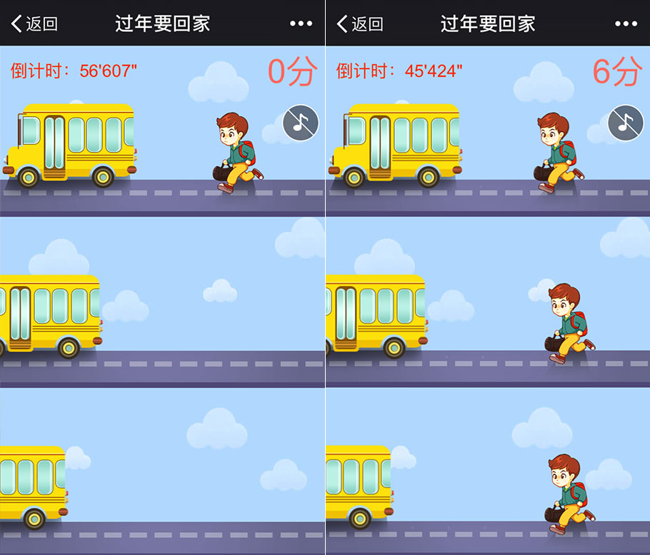 過年過年,回家團圓。還有什么比趕上最后一班車更幸福的事呢?持續(xù)點擊屏幕,讓小男孩趕上回家的最后一班車。游戲過程中,注意防止任何一個男孩落后,否則游戲結束。