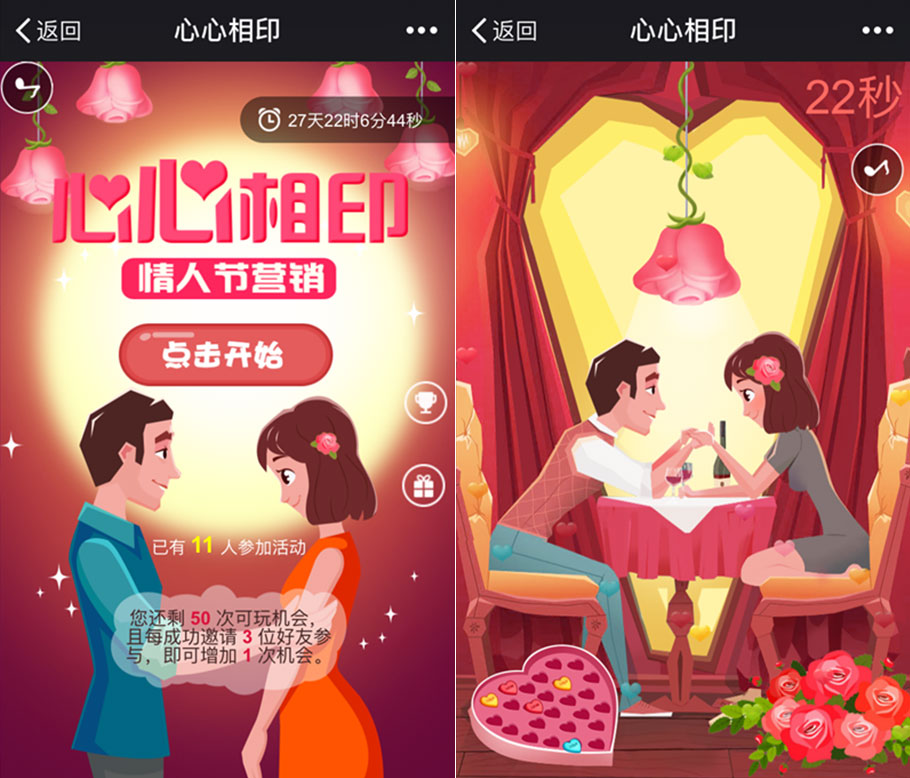 這款游戲以情人節(jié)為主題,適宜商家用于情人節(jié)營(yíng)銷(xiāo)。無(wú)論是鮮花、商城、餐飲,還是房產(chǎn)、汽車(chē)、酒店、景點(diǎn)等行業(yè),都可以通過(guò)相關(guān)獎(jiǎng)品設(shè)置,吸引粉絲參與,達(dá)到商家的營(yíng)銷(xiāo)目的。