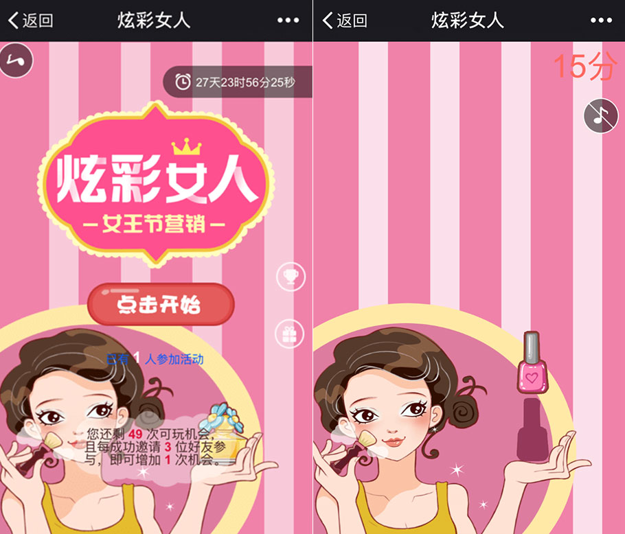這款游戲均為三八婦女節(jié)的營銷而開發(fā),適用行業(yè)廣泛。比如商城、餐飲、娛樂、美業(yè)、鮮花等等行業(yè),都可以結(jié)合節(jié)日的氣氛與熱度,達(dá)到宣傳品牌、推廣新品、漲粉引流、互動傳播等等營銷目的。