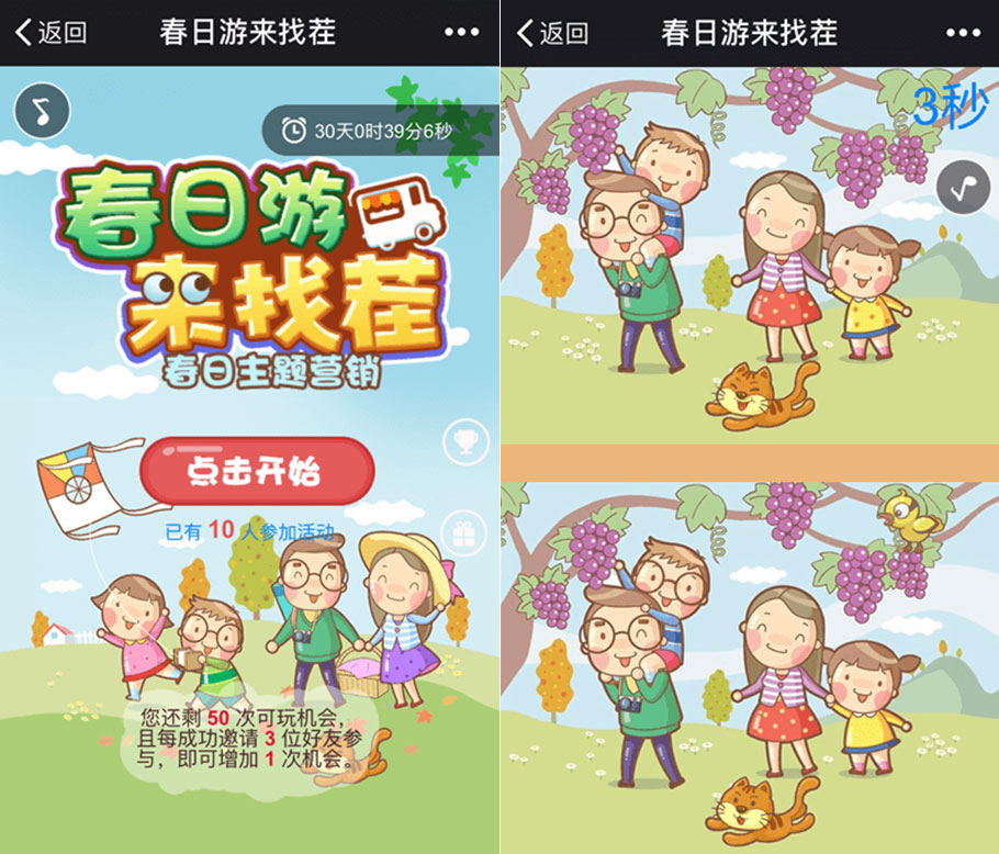 春日晴方好,全家出動去踏青!考眼力的時候到了,快來看看兩張圖里有哪些不同之處?盡快找出游戲關(guān)卡中上下兩張圖的不同之處,并點擊它。點錯將會被罰5秒,一共三關(guān)。順利闖關(guān),用時最短者,排名越高。