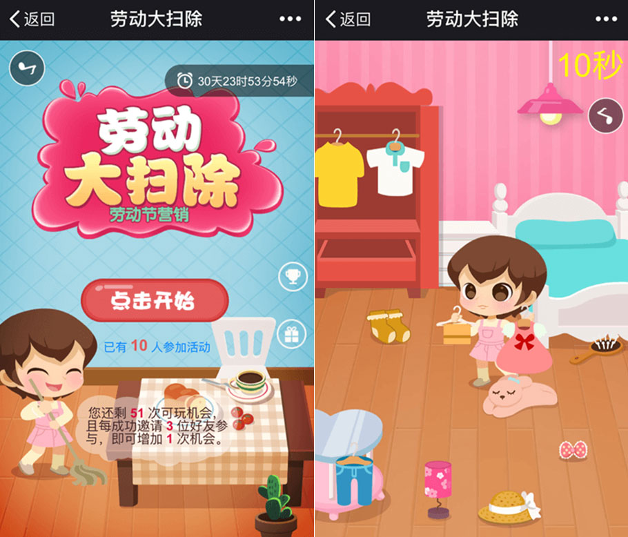五一勞動(dòng)大掃除,“亂室佳人”改當(dāng)居家勞模。點(diǎn)擊屏幕中的物品,將它們放回原位,比如衣服掛在衣柜里,垃圾扔在紙簍里等等。成功放回所有物品,用時(shí)越短,排名越高。