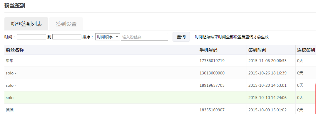 疑難點:在后臺查詢粉絲簽到記錄,輸入的時間必須全部設(shè)置好才可以生效