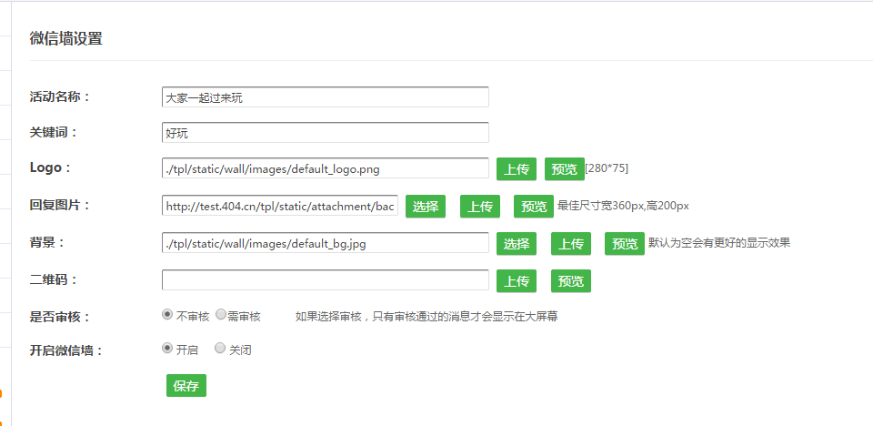 在[微現(xiàn)場(chǎng)][微信墻]中添加活動(dòng),對(duì)添加的活動(dòng)進(jìn)行如下設(shè)置:
