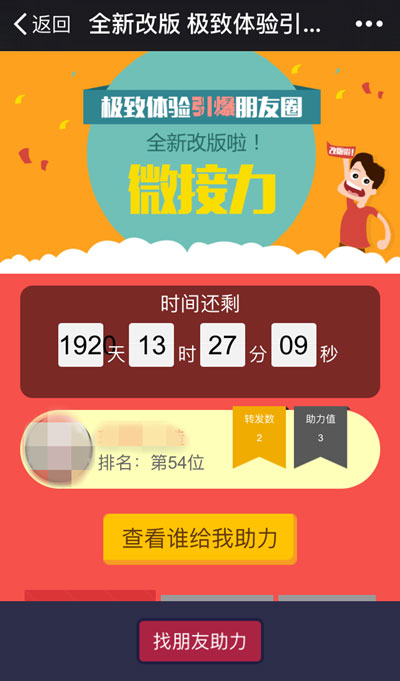 改版后的微助力新增了數(shù)據(jù)統(tǒng)計(jì)功能,實(shí)時(shí)統(tǒng)計(jì)微助力各項(xiàng)數(shù)據(jù)。粉絲可以在界面上查看自己的排名、當(dāng)前接力值、轉(zhuǎn)發(fā)數(shù)、助力排行TOP10、誰為我助力等數(shù)據(jù)。清晰地?cái)?shù)據(jù)呈現(xiàn)讓粉絲更了解自己的微接力力進(jìn)程,進(jìn)而更加賣力地轉(zhuǎn)發(fā)活動(dòng)。商家的廣告也在粉絲的轉(zhuǎn)發(fā)吆喝中得到爆炸式傳播。