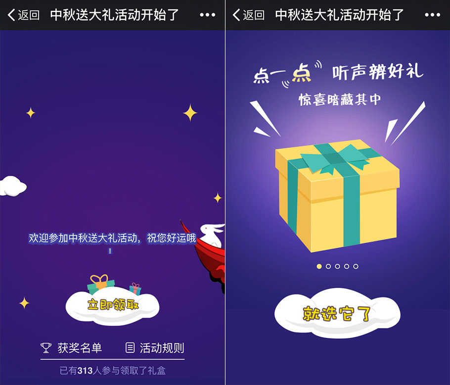 粉絲在關(guān)注公眾號(hào)之后,如果想?yún)⑴c拆禮盒抽獎(jiǎng)活動(dòng),他必須把該活動(dòng)信息轉(zhuǎn)發(fā)給若干微信好友,達(dá)到分享數(shù)量之后才可以拆開禮盒里的東西。