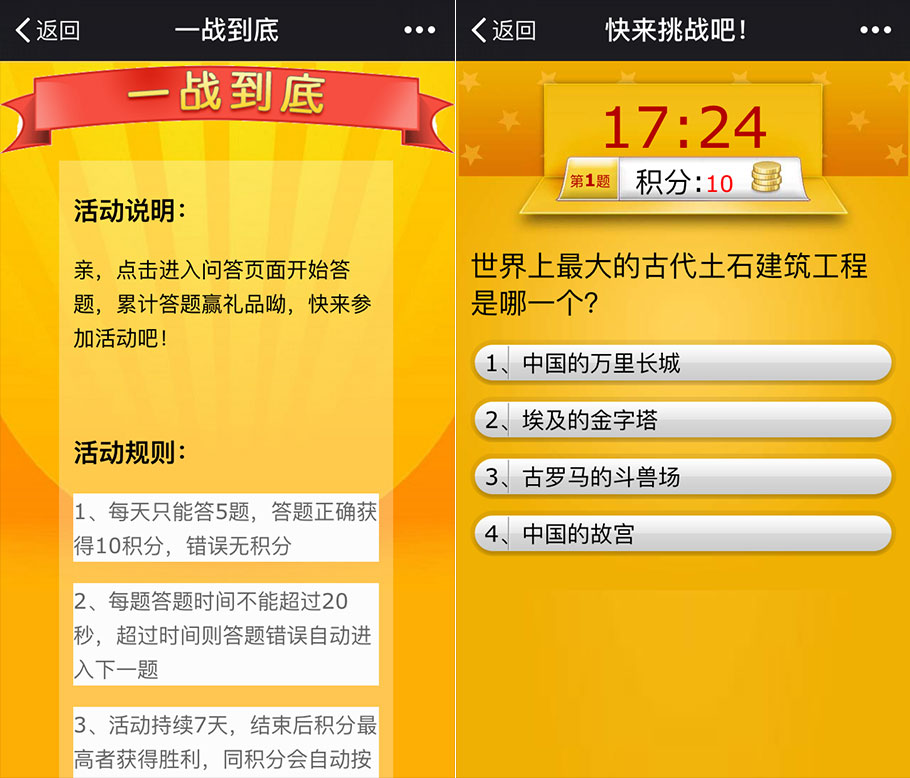 一戰(zhàn)到底是一款益智答題類(lèi)的微信營(yíng)銷(xiāo)應(yīng)用,商家可以把跟自身相關(guān)的商業(yè)信息作為題目,讓微信粉絲參與答題的同時(shí)可以強(qiáng)化商家的營(yíng)銷(xiāo)信息和品牌概念。