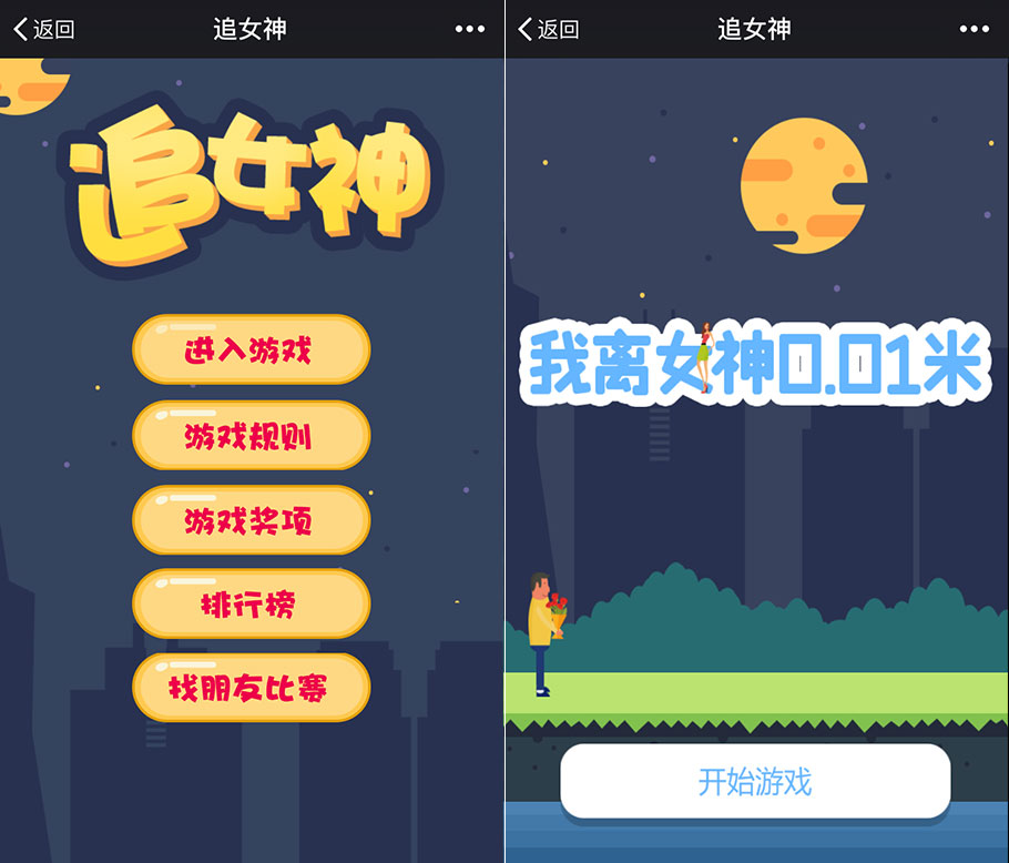 《追女神》作為節(jié)日營銷游戲,在特殊的節(jié)日推出,比如情人節(jié)、七夕節(jié)。一款非常接地氣的吸粉小游戲。在現(xiàn)實生活中單身了二三十年的汪仔們,可以在這款游戲里盡情體驗追女神的樂趣。