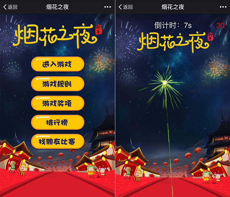 《煙花之夜》,這是一款光芒璀璨顏值沖破天際的游戲,適合在元旦、春節(jié)、元宵等節(jié)日,作為商家的營銷吸粉小活動(dòng)推出。絢麗多彩的煙花綻放在夜空,承載著祝福與歡樂。