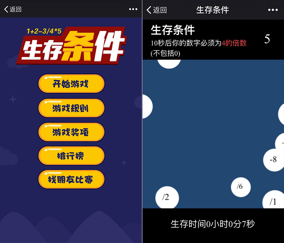 《生存條件》是一款拼智力拼反應(yīng)的挑戰(zhàn)類游戲。游戲隨機(jī)“開(kāi)價(jià)”,玩家需要按照指示,找出滿足條件的數(shù)字,才可延長(zhǎng)在游戲里的生存時(shí)間。