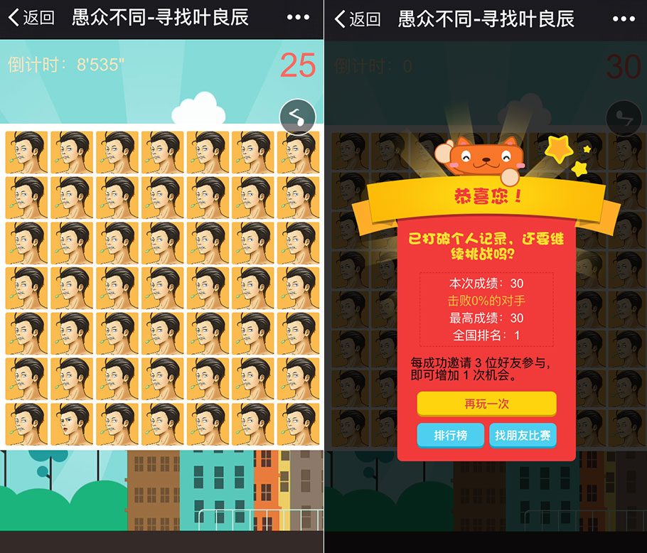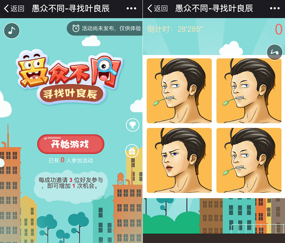 《愚眾不同》是一款走心走腎的愚人節(jié)小游戲。顏值上癮,劇情離奇,玩法簡單易上手,眾里尋他大不同。愚人節(jié)特供游戲,主打詼諧幽默風(fēng)格。商家可直接在后臺設(shè)置游戲規(guī)則、獎項等具體內(nèi)容;讓粉絲在節(jié)日氣氛里,一邊享受游戲帶來的歡樂,一邊追趕商家配置的獎品。