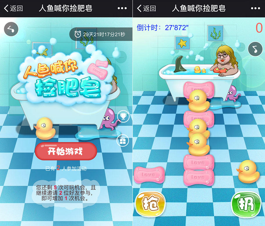 《人魚喊你撿肥皂》浴缸里驚現(xiàn)美人魚,面露迷之微笑;掉在地上的肥皂,小哥方便撿一下嗎?精心打制的年度最無節(jié)操微游戲之《人魚喊你撿肥皂》,以其別有韻味的游戲畫風(fēng)和突破底線的玩法,摧毀你的精神世界,重刷您的三觀。如此喪心病狂的游戲,小編不得不說,干得漂亮!