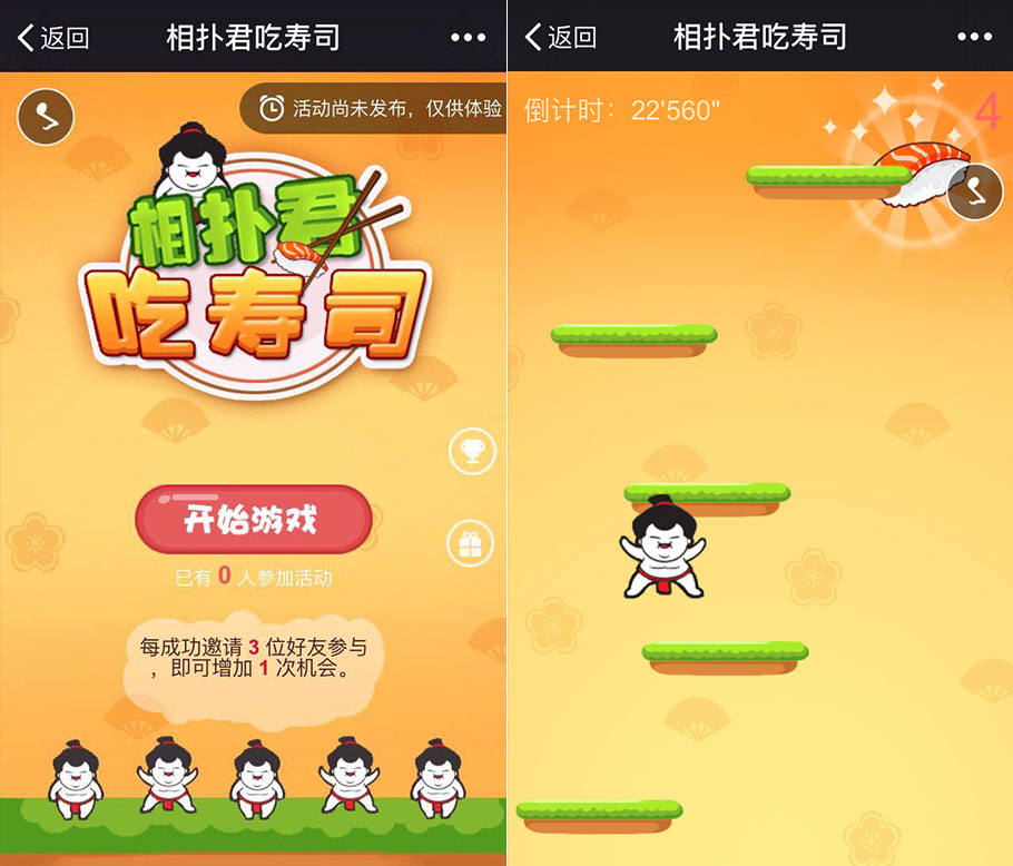 《相撲君吃壽司》是一款休閑彈跳類微營銷小游戲。小清新日式畫風(fēng),搭載簡(jiǎn)單易上手的玩法。玩家需要左右傾斜手機(jī),來控制相撲君的跳躍方向,讓相撲君“更讓一層樓”,朝著美味的壽司奮進(jìn)!