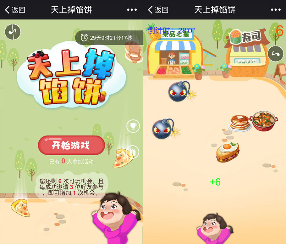 《天上掉餡餅》粉絲按住游戲人物左右滑動,即可吃到從天而降的美食。以“吃”為主,可作為商家營銷吸粉+宣傳推廣的重磅武器,尤其是餐飲行業(yè)(當(dāng)然,其它行業(yè)也是可以用噠~~)。非常適合餐飲行業(yè)的商家,將其作為自家品牌營銷的主題游戲。