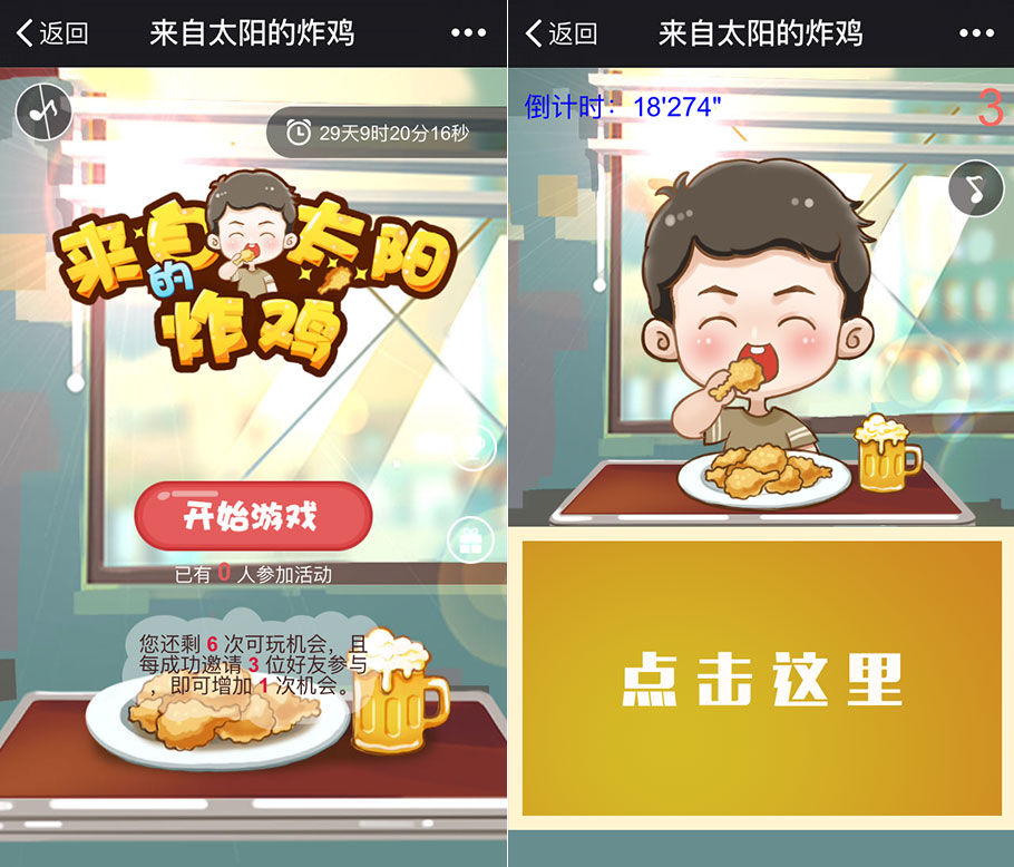 《來自太陽的炸雞》以帥到掉渣的宋歐巴為原型,畫風(fēng)Q萌,玩法十分簡單。粉絲只需點(diǎn)擊屏幕按鈕,即可為歐巴送上美味的炸雞。以“吃”為主,可作為商家營銷吸粉+宣傳推廣的重磅武器,尤其是餐飲行業(yè)(當(dāng)然,其它行業(yè)也是可以用噠~~)。非常適合餐飲行業(yè)的商家,將其作為自家品牌營銷的主題游戲。