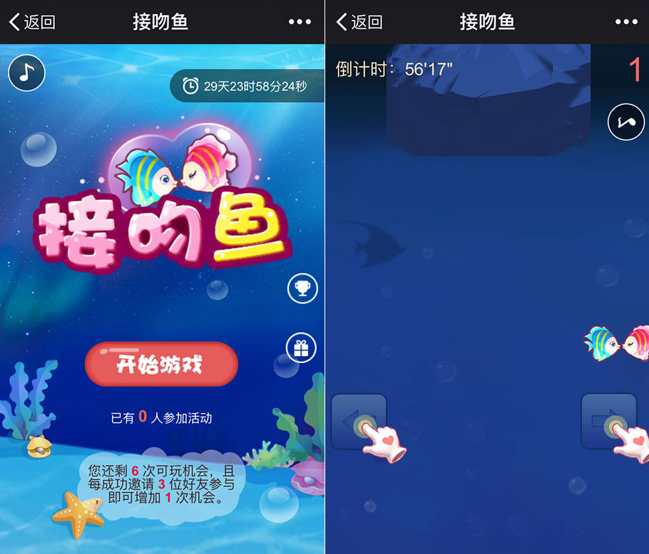 《接吻魚(yú)》是一款?yuàn)蕵?lè)休閑類(lèi)的微營(yíng)銷(xiāo)游戲,玩法簡(jiǎn)單易上手,畫(huà)風(fēng)稍虐單身狗。小編強(qiáng)烈建議單身粉絲在好基友的陪同下觀賞、玩耍該游戲。