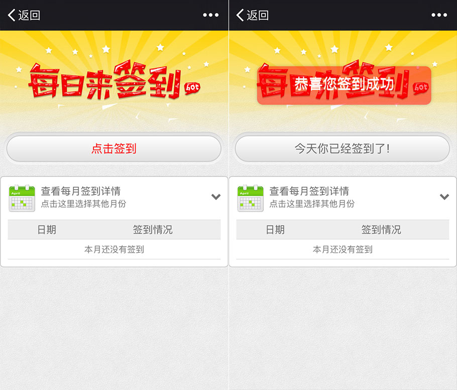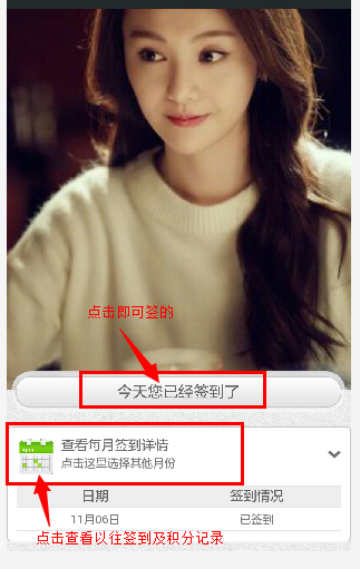 之后點(diǎn)擊圖文信息進(jìn)入到簽到界面,點(diǎn)擊即可簽到,手機(jī)端效果如下圖: