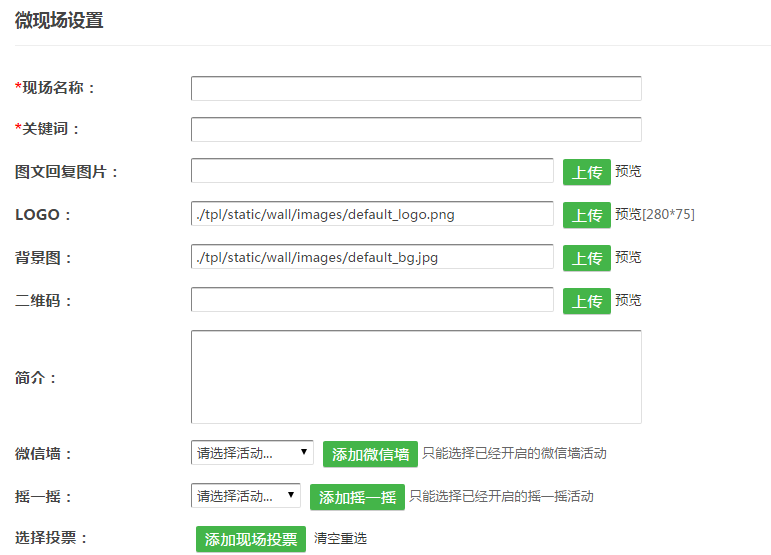 3. Logo、背景圖:logo是指觸發(fā)現(xiàn)場活動回復(fù)的圖文信息的封面圖片,背景圖是指大屏幕背景圖。