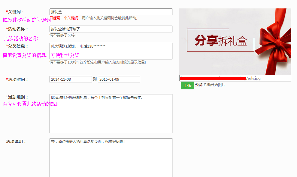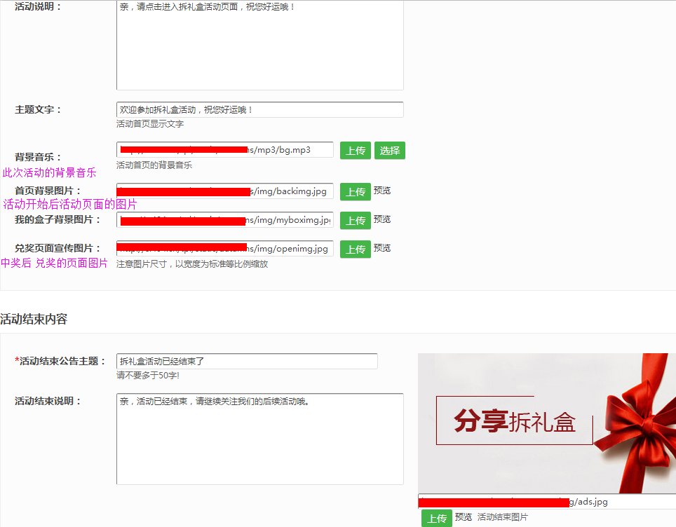 一、在微活動(dòng)——拆禮盒——新增拆禮盒活動(dòng)設(shè)置拆禮盒,如下圖: