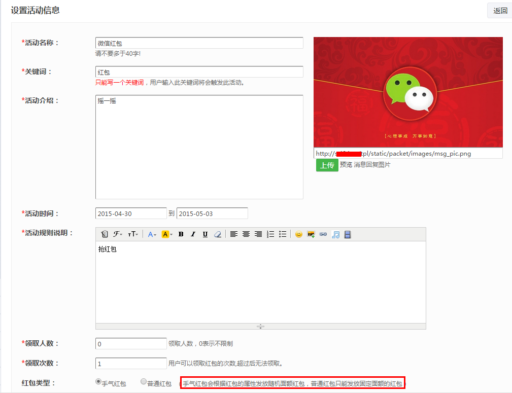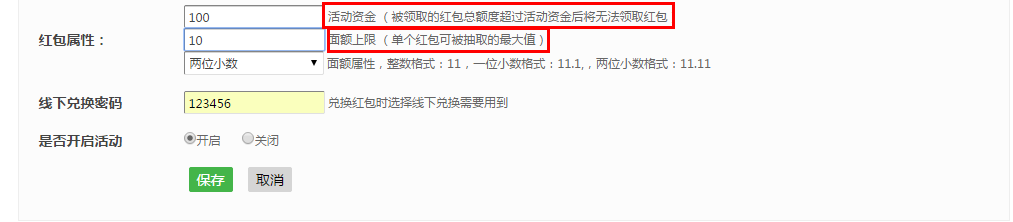 對(duì)新添的紅包活動(dòng)進(jìn)行如下設(shè)置: