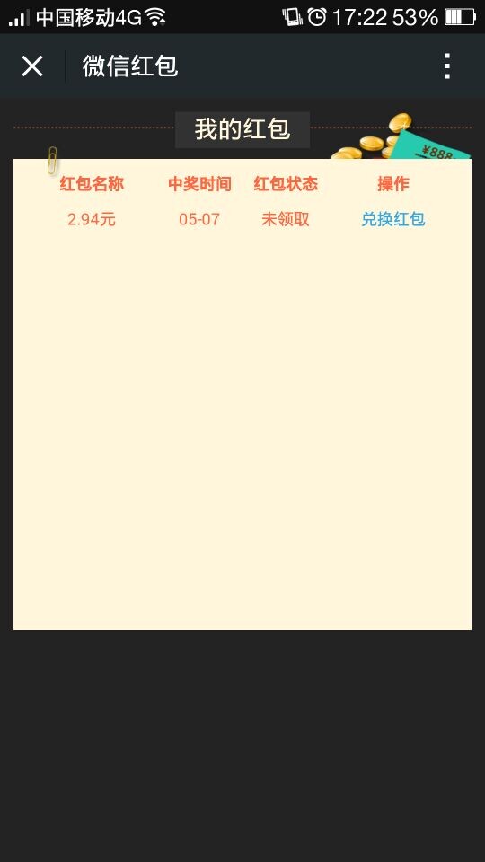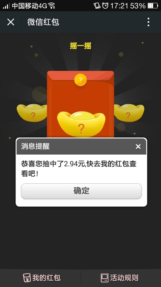點(diǎn)擊頁面中的紅包會(huì)提示抽到多大的紅包,點(diǎn)擊下端【我的紅包】,如下: