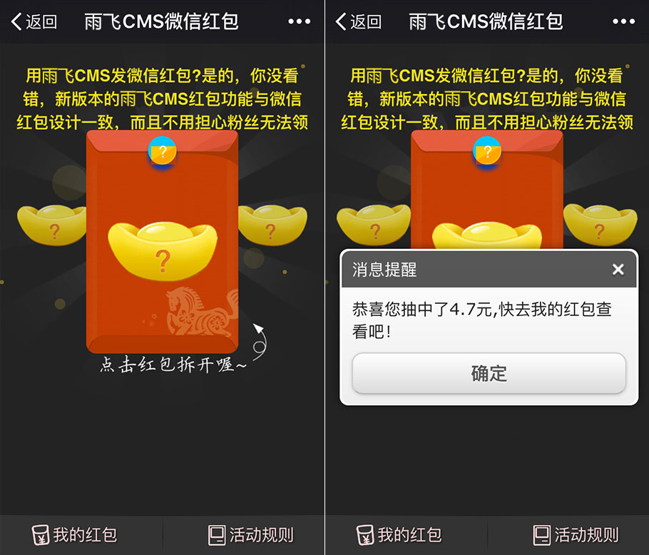 YfdCms系統(tǒng)管理后臺(tái)【微活動(dòng)】 【微信紅包】中添加或管理。 后臺(tái)設(shè)置關(guān)鍵詞觸發(fā)后可領(lǐng)取微信紅包,紅包分為手氣紅包跟普通紅包兩種。領(lǐng)取方式分線下領(lǐng)取跟轉(zhuǎn)至?xí)T卡兩種形式。