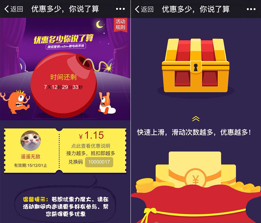 邀請的好友越多,粉絲累計(jì)的優(yōu)惠就越大,這無疑是打開了粉絲傳播的大門。粉絲熱火朝天地分享與轉(zhuǎn)發(fā),讓商家的活動(dòng)與品牌在朋友圈得到爆炸式傳播。