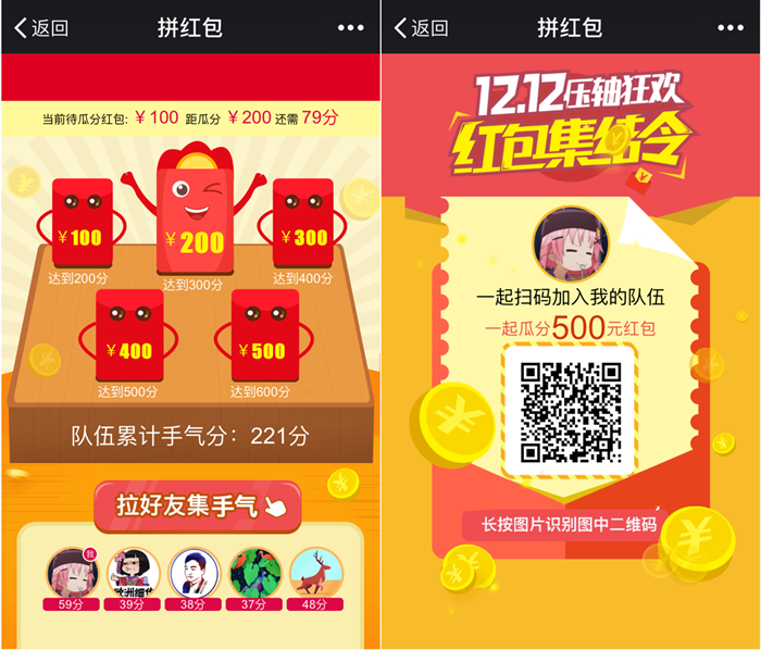 每位加入的好友隨機(jī)獲得手氣分,隊伍總分達(dá)到商家設(shè)置的級別要求,隊伍成員即可瓜分該級別下的紅包。