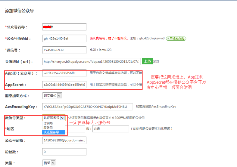 添加上AppID和AppSecret數(shù)據(jù)值,微信號(hào)類型一定選擇相應(yīng)類型。AppID和AppSecret數(shù)據(jù)值在(微信公眾號(hào)平臺(tái)→開發(fā)者中心)查找。